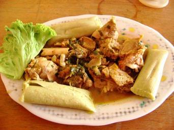 Keywords: Cabrito con tamales.JPG es Cabrito con tamales Piura Perú own Dtarazona Goat dishes of Peru Cabrito