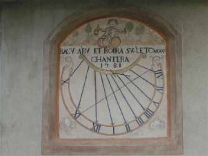 | Keywords: Cadran solaire. Hameau du Peuil.PNG Artwork LangSwitch Sundial on the facade of an old inn Cadran solaire sur la façade d'une ancienne auberge <br> LangSwitch Decor Décor LangSwitch Two lilies Deux fleurs de lys LangSwitch Bacchus drink on a barrel in one hand a pitcher and the other a tumbler He wears a wig and is of brocade jacket with breeches which stops at the knees followed by hoses Bacchus boit sur un tonneau un pichet d'une main et une timbale de l'autre Il porte une perruque en ailes de pigeon et revêt une veste de brocart avec une culotte qui s ™arrête aux genoux suivie de bas de chausse LangSwitch The ten strings of a lyre represent hours of the dial of the afternoon They join the soundboard bringing their numbers in Roman numerals The rod is T There is an equatorial line Les dix cordes d'une lyre représentent les heures de ce cadran déclinant de l'après-midi Elles joignent la table d'harmonie qui porte leurs numéros en chiffres romains Le style est en T Il existe une ligne équatoriale 1781 Technique mural place of discovery object history exhibition history credit line LangSwitch Motto Devise <br> LangSwitch Baccus drank and will drink and will sing on the barrel BACV A'BV ET BOIRA SU<small>R</small>'LE TO<small>NEAV</small> CHANTERA 1781 LangSwitch Restored by the workshop Tournesol in 2000 Restauré par l'atelier Tournesol en 2000 <br> LangSwitch See Voir <gallery>File Cadran solaire Lans-en-Vercors Peuil Notice explicative JPG Notice explicative Cadran solaire du Peuil </gallery> Société astronomique de France 3820501-1 Numéro d'identification de la Société astronomique de France S A F 3820501-1 Isère accession number place of creation Hameau du Peuil Lans en “Vercors Isère France cite web Balades en Isère Lans-en-Vercors https //baladesenisere wordpress com/tag/lans-en-vercors/ 2015 05 15 2015 09 06 fr PD-old-100 cite web Atelier Tournesol Cadrans restaurés 2000 Lans-en-Vercors ancienne auberge au hameau du Peuil Isère http //atelier tournesol free fr/ 11 2012 06 09 2015 fr cite web Gaëlle Yeretzian Anne Cayol-Gerin Département de l'Isère Patrimoine de l'Isère Bases de données Décors Lans-en-Vercors http //www isere-patrimoine fr/TP 20L_CODE/TPL_SITEPATRIMONIAL/PAR_TPL_IDENTIFIANT/119/1272-base htm 2015 09 10 fr Uploaded with UploadWizard Vertical sundials in France Sundials in Isère Lans-en-Vercors |