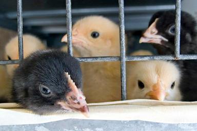 Keywords: cage chicks babies yellow black beak chicken metal