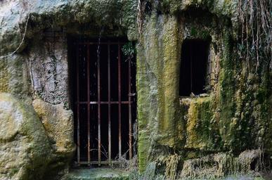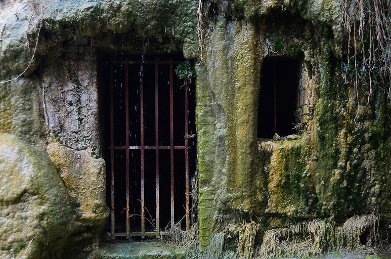 Keywords: cage door window grille old stone mountain prison water dampness green weed