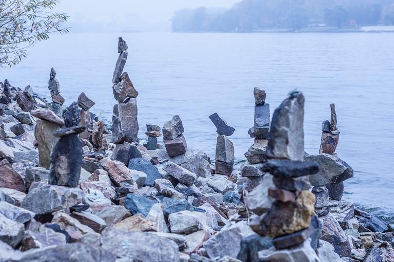 Keywords: cairn stones stone tower pile tower cairn art artwork water coast mood nature fog rhine river weather mood still life atmosphere landscape bank shore stone