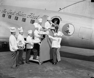 | Keywords: Cakes for sky riders. Washington, D.C.25128v.jpg en Air travelers leaving Washington Airport during National Air Travel Week Oct 2 9 are being given a special treat Cakes baked from their favorite recipes are being put aboard each plane by chefs of the leading hotels in the Capitol Marjorie McKinnon Eastern Airline hostess is pictured receiving the delicacies from left to right Theophile Homberger Hotel Hamilton; Eddie Weber Shoreham; Joseph Cattaneo Washington; Fritz Meissner Hay-Adams; Abraham Grob Wardman Park; Joseph Tucci Raleigh; Jacques Haerringer Shoreham; Otto Merz Willard 10/4/38 1938 October 4 1 negative glass 4 x 5 in or smaller accession number Reproduction Number LC-DIG-hec-25128 digital file from original negative Call Number LC-H22-D- 4645 P P Repository Library of Congress Prints and Photographs Division Washington D C 20540 USA http //hdl loc gov/loc pnp/pp print Title from unverified caption data received with the Harris Ewing Collection Gift; Harris Ewing Inc 1955 General information about the Harris Ewing Collection is available at http //hdl loc gov/loc pnp/pp hec Temp note Batch five LOC-image hec 25128 Harris Ewing Rights Advisory No known restrictions on publication <gallery> File Cakes for the sky riders 25128a tif </gallery> DC Past http //dcpast com/post/84027912775/cakes-for-sky-riders Custom license marker 2014 04 27 PD-Harris-Ewing Uploaded with UploadWizard Douglas DC-3 Ronald Reagan Washington National Airport 1938 in Washington D C |