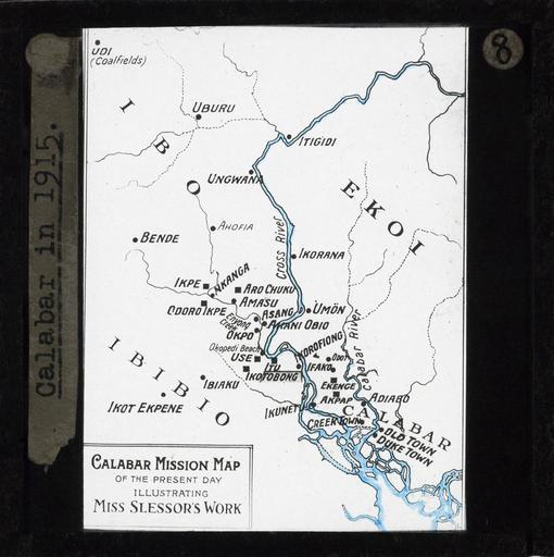 | Keywords: Calabar in 1915 (imp-cswc-GB-237-CSWC47-LS2-008).jpg en <br> Calabar in 1915 Map of Calabar in 1915 Calabar mission map of the present day illustrating Mary Slessor's work At the age of 27 Mary Slessor became a missionary in Calabar located within later day Nigeria Photographer Unknown Subject personal name Slessor Mary Mitchell 1848-1915 Filename imp-cswc-GB-237-CSWC47-LS2-008 tif Coverage date 1915 Part of collection International Mission Photography Archive ca 1860-ca 1960 Type images Part of subcollection Photographs from the Centre for the Study of World Christianity University of Edinburgh U K ca 1900-ca 1940s Repository name Centre for the Study of World Christianity Archival file impaunpub_Volume7/1282 url Repository address The University of Edinburgh School of Divinity New College Mound Place Edinburgh EH1 2LX United Kingdom Geographic subject country Nigeria Format aacr2 1 lantern slide 8 x 8 cm Geographic subject continent Africa Rights Contact the repository for details Part of series Mary Slessor LS2 Repository email divinity-CSWC ed ac uk Subject lcsh Keyword maps; missionaries Date created circa 1880 Publisher of the digital version University of Southern California Libraries Subject aat genre topographical views Format aat lantern slides Legacy record ID impa-m68152 Access conditions http //www ed ac uk/schools-departments/divinity/research/centres/world-christianity/collections-resources File GB 237 CSWC47/LS2/8 1880 author http //digitallibrary usc edu/cdm/ref/collection/p15799coll123/id/64405 PD-old-70-1923 Magic lantern images Images from USC Digital Library uploaded by Fæ International Mission Photography Archive ca 1860-ca 1960 Calabar Maps of Nigeria |
