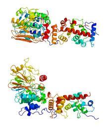 | Keywords: Calcineurin 1AUI.png en 3d structure of calcineurin from PDB 1AUI Ref C R Kissinger et al 1995 Crystal structures of human calcineurin and the human FKBP12-FK506-calcineurin complex Nature 378 641-644 PMID 8524402 DOI 10 1038/378641a0 adapted from http //www pdb org/pdb/files/1aui pdb using PyMOL own work 2008-09-14 http //www ebi ac uk/pdbsum/1AUI Hydrolases |