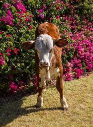Keywords: calf cattle stock brown white young standing garden flowers farm beef rural cow bull queensland australia