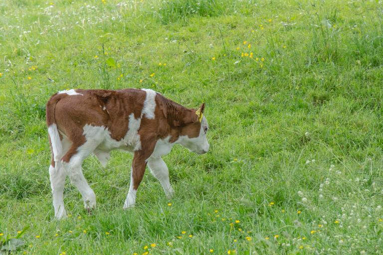 Keywords: calf cow meadow agriculture beef young animal livestock cattle cute domestic cattle grass lonely