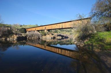 Keywords: california covered bridge historical landmark reflections summer spring river stream water nature outside sky trees architecture beautiful