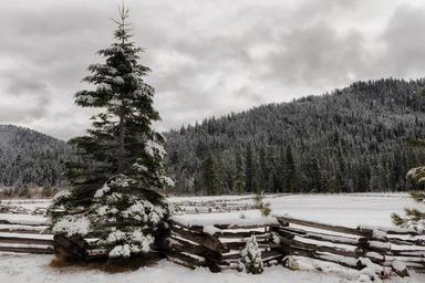 Keywords: california landscape scenic winter snow ice mountains forest trees wooden fence sky clouds nature outside countryside