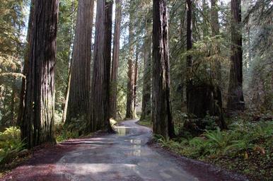 Keywords: california redwoods redwood trees trees redwoods road forest woods giant trees wet