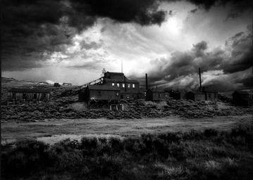 Keywords: california sky clouds black and white mining buildings plants brush deserted abandoned beautiful