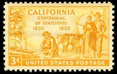 | Keywords: California statehood 1950 U.S. stamp.tiff en California commemorated statehood ™s 100th anniversary with a 3-cent stamp on September 9 1950 The vignette shows a miner panning gold and a pioneer couple walking alongside an oxen drawn covered wagon The left vertical panel shows a citrus tree and the ship bring news of California ™s statehood 2014-04-09 17 22 36 Arago people postage the post online National Postal Museum Bureau of Printing and Engraving PD-USGov Uploaded with UploadWizard U S territories on stamps Stamps of the United States 1941-1950 |