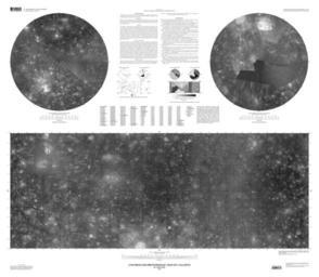 | Keywords: Callisto USGS map.jpg LargeImage en Prepared on behalf of the Planetary Geology and Geophysics Program Solar System Exploration Division Office of Space Science National Aeronautics and Space Administration This sheet is one in a series of maps of the Galilean satellites of Jupiter at a nominal scale of 1 15 000 000 This series is based on data from the Galileo Orbiter Solid-State Imaging SSI camera and the cameras of the Voyager 1 and 2 spacecraft Mercator and Polar Stereographic projections used for this map of Callisto are based on a sphere having a radius of 2 409 3 km The scale is 1 8 388 000 at ±56° latitude for both projections Longitude increases to the west in accordance with the International Astronomical Union 1971 Seidelmann and others 2002 The geometric control network was computed at the RAND Corporation using RAND's most recent solution as of April 1999 Davies and Katayama 1981; Davies and others 1998 This process involved selecting control points on the individual images making pixel measurements of their locations using reseau locations to correct for geometric distortions and converting the measurements to millimeters in the focal plane These data are combined with the camera focal lengths and navigation solutions as input to photogrammetric triangulation software that solves for the best-fit sphere the coordinates of the control points the three orientation angles of the camera at each exposure right ascension declination and twist and an angle W0 which defines the orientation of Callisto in space W0-in this solution 259 51°-is the angle along the equator to the east between the 0° meridian and the equator's intersection with the celestial equator at the standard epoch J2000 0 This solution places the crater Saga at its defined longitude of 326° west Seidelmann and others 2002 This global map base uses the best image quality and moderate resolution coverage supplied by Galileo SSI and Voyager 1 and 2 Batson 1987; Becker and others 1998; Becker and others 1999; Becker and others 2001 The digital map was produced using Integrated Software for Imagers and Spectrometers ISIS Eliason 1997; Gaddis and others 1997; Torson and Becker 1997 The individual images were radiometrically calibrated and photometrically normalized using a Lunar-Lambert function with empirically derived values McEwen 1991; Kirk and others 2000 A linear correction based on the statistics of all overlapping areas was then applied to minimize image brightness variations The image data were selected on the basis of overall image quality reasonable original input resolution from 20 km/pixel for gap fill to as much as 150 m/pixel and availability of moderate emission/incidence angles for topography Although consistency was achieved where possible different filters were included for global image coverage as necessary clear for Voyager 1 and 2; clear and green 559 nm for Galileo SSI Individual images were projected to a Sinusoidal Equal-Area projection at an image resolution of 1 0 kilometer/pixel The final constructed Sinusoidal projection mosaic was then reprojected to the Mercator and Polar Stereographic projections included on this sheet The final mosaic was enhanced using commercial software Names on this sheet are approved by the International Astronomical Union Names have been applied for features clearly visible at the scale of this map; for a complete list of nomenclature for Callisto please see the Gazeteer of Planetary Nomenclature Font color was chosen only for readability http //geopubs wr usgs gov/i-map/i2770/ USGS 2002-05-01 File Callisto equatorial jpg File Callisto north pole jpg File Callisto south pole jpg Maps of Callisto PD-USGov |
