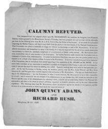 | Keywords: Calumy Refuted.jpg en Photograph of work entitled Calumny Refuted the unexpected and very singular attack upon Mr Richardson the candidate for Congress from Plymouth District which appeared in the Massachusetts Journal on Tuesday has been promptly met and we trust will be effectually put down by the following letter from Mr R to D L Child Esq the Editor of the Journal Work mentions John Quincy Adams Richard Rush and Joseph Richardson Printed at Hingham Massachusetts The Library of Congress Washington D C http //memory loc gov/rbc/rbpe/rbpe05/rbpe054/05401400/001dr jpg Author 1828 History of Massachusetts John Quincy Adams PD-USGov |