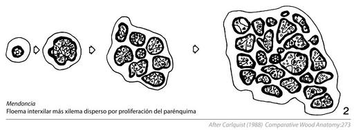 | Keywords: Cambial Variants (Anomalous Secondary Growth) Fig. 8.7.2 Mendoncia (in Spanish).svg en Fig 8 7 Stems fo lianas that show a combination of cambial variants machaerium combines flattened stems with succesive cambia Mendoncia has interxylary phloem plus fragmentation of the cambium into segments Thinouia has a kind of succesive cambial activity origin of strands of vascular tissue in cortex plus lobed stems in Fig 8 4 Conventions for this and other figures in this chapter black phloem blank with circles indicating vessels xylem; stippled axial parenchyma vertical or variously diagonal lines in pairs rays 1988-01-01 S Carlquist 1988 p 273 Fig 8 7 Chapter 8 Cambial Variants Anomalous Secondary Growth In Comparative Wood Anatomy Part of the series Springer Series in Wood Science Springer Verlag Berlin Heidelberg S Carlquist 1988 other versions Custom license marker 2016 05 08 Tracing data from a scientific diagram taken from primary scientific literature not the scope of copyright laws PD-ineligible Equivalent to cc-0 Wood anatomy Mendoncia |