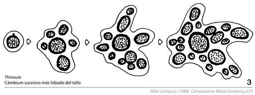 | Keywords: Cambial Variants (Anomalous Secondary Growth) Fig. 8.7.3 Thinouia (in Spanish).svg en Fig 8 7 Stems fo lianas that show a combination of cambial variants machaerium combines flattened stems with succesive cambia Mendoncia has interxylary phloem plus fragmentation of the cambium into segments Thinouia has a kind of succesive cambial activity origin of strands of vascular tissue in cortex plus lobed stems in Fig 8 4 Conventions for this and other figures in this chapter black phloem blank with circles indicating vessels xylem; stippled axial parenchyma vertical or variously diagonal lines in pairs rays 1988-01-01 S Carlquist 1988 p 273 Fig 8 7 Chapter 8 Cambial Variants Anomalous Secondary Growth In Comparative Wood Anatomy Part of the series Springer Series in Wood Science Springer Verlag Berlin Heidelberg S Carlquist 1988 other versions Custom license marker 2016 05 08 Tracing data from a scientific diagram taken from primary scientific literature not the scope of copyright laws PD-ineligible Equivalent to cc-0 Wood anatomy Thinouia |