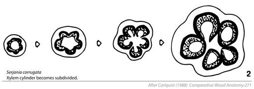 | Keywords: Cambial Variants (Anomalous Secondary Growth) Fig. 8.6.2 Serjania corrugata.svg en Fig 8 6 Cambial variants in which the cambium is or becomes separated into several segments Four stages in development are shown for each species Flabellaria has origin of xylem segments outside the original cylinder; these segments are expanded and dispersed by parenchyma proliferation Serjania corrugata has a xylem cylinder consisting of arcs in sectional view ; the arcs are converted to cylinders Serjania fuscifolia has cortical bundles; xylem is added to each of these and to the original cylinder in Fig 8 4 Conventions for this and other figures in this chapter black phloem blank with circles indicating vessels xylem; stippled axial parenchyma vertical or variously diagonal lines in pairs rays 1988-01-01 S Carlquist 1988 p 271 Fig 8 6 Chapter 8 Cambial Variants Anomalous Secondary Growth In Comparative Wood Anatomy Part of the series Springer Series in Wood Science Springer Verlag Berlin Heidelberg S Carlquist 1988 other versions Custom license marker 2016 05 08 Tracing data from a scientific diagram taken from primary scientific literature not the scope of copyright laws PD-ineligible Equivalent to cc-0 Wood anatomy Serjania corrugata |