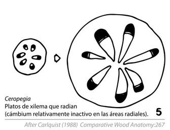 | Keywords: Cambial Variants (Anomalous Secondary Growth) Fig. 8.5.5 Ceropegia.svg en Fig 8 5 Diagrammatic representations showing ontogenetic sequences in cambia that have normal products phloem to outside xylem to inside but abnormal conformation Cambium produces more xylem in some places than others to achieve flattened or lobed stems Grooved xylem results from cambium that acts unilaterally little or no xylem in grooves Phaedranthus ; progressively unilateral activity may expand along margins of grooves resulting in ledged zig-zag appearance Passiflora Presence of xylem plates separated by rays results from sluggish cambial activity in ray areas in Fig 8 4 Conventions for this and other figures in this chapter black phloem blank with circles indicating vessels xylem; stippled axial parenchyma vertical or variously diagonal lines in pairs rays 1988-01-01 S Carlquist 1988 p 267 Fig 8 5 Chapter 8 Cambial Variants Anomalous Secondary Growth In Comparative Wood Anatomy Part of the series Springer Series in Wood Science Springer Verlag Berlin Heidelberg S Carlquist 1988 other versions Custom license marker 2016 05 08 Tracing data from a scientific diagram taken from primary scientific literature not the scope of copyright laws PD-ineligible Equivalent to cc-0 Wood anatomy Ceropegia |