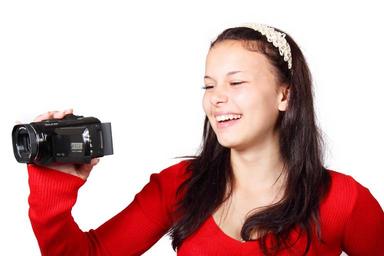 Keywords: camcorder camera digital equipment female filming fun girl happy holding isolated smile smiling technology video woman young