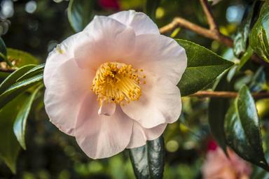 | Keywords: plant flower outdoor blossom Camellia japonica is a flowering tree or shrub, usually 1.5–6 metres (4.9–19.7 ft) tall, but occasionally up to 11 metres (36 ft) tall. Some cultivated varieties achieve a size of 72m² or more. The youngest branches are purplish-brown, becoming grayish-brown as they age. The alternately arranged leathery leaves are dark green on the top side, paler on the underside, usually 5–11 centimetres (2.0–4.3 in) long by 2.5–6 centimetres (1.0–2.4 in) wide with a stalk (petiole) about 5–10 millimetres (0.2–0.4 in) long. The base of the leaf is pointed (cuneate), the margins are very finely toothed (serrulate) and the tip somewhat pointed. en.wikipedia.org/wiki/Camellia_japonica Camellia japonica is a flowering tree or shrub, usually 1.5–6 metres (4.9–19.7 ft) tall, but occasionally up to 11 metres (36 ft) tall. Some cultivated varieties achieve a size of 72m² or more. The youngest branches are purplish-brown, becoming grayish-brown as they age. The alternately arranged leathery leaves are dark green on the top side, paler on the underside, usually 5–11 centimetres (2.0–4.3 in) long by 2.5–6 centimetres (1.0–2.4 in) wide with a stalk (petiole) about 5–10 millimetres (0.2–0.4 in) long. The base of the leaf is pointed (cuneate), the margins are very finely toothed (serrulate) and the tip somewhat pointed. en.wikipedia.org/wiki/Camellia_japonica |