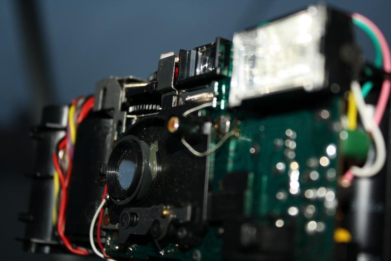 Keywords: camera circuit board electronics old recycling resistance soldering disruption isärplockad open closeup technical