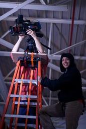 Keywords: camera crew film filming video teamwork cameraman equipment ladder