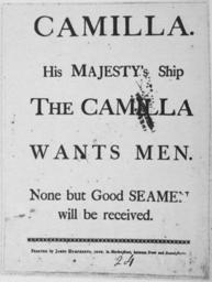 Keywords: Camilla-1778.jpg From http //hdl loc gov/loc rbc/rbpe 14500300 Full text <nowiki> Begin handwritten 1778 End handwritten CAMILLA His MAJESTY's Ship THE CAMILLA WANTS MEN Begin stamped text Omitted text 2l End stamped text None but Good SEAMEN will be received Printed by James Humphreys junr in Market-street between Front and Second-streets Begin handwritten 24 End handwritten </nowiki> PD-old United States Merchant Marine