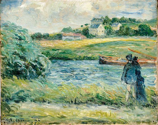 | Keywords: Camille Pissarro Promenade au Bord de l Eau Pontoise 1877.jpg Artwork Creator Camille Pissarro 1877 oil on canvas size cm 21 8 27 3 object history exhibition history credit line Inscription C Pissarro 77 Signature bottom left verso Stempel Couleurs Fines/Place du Louvre/Colin/19 Rue Des Prêtres 19 <br>Etikett 39 Pissarro Bords de rivière H 22c; L 27c accession number place of creation http //www suppanfinearts com/Werke/pissaro html Galerie Suppan Q21741448 PD-old-100 Images from Galerie Suppan Paintings of Pontoise by Camille Pissarro 1877 paintings by Camille Pissarro |