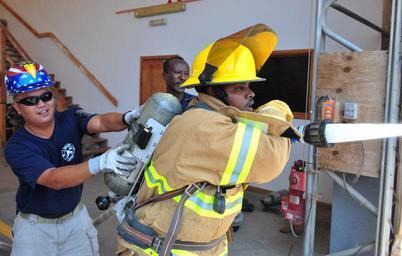 | Keywords: Camp Lemonnier activity DVIDS272748.jpg en Suraj Magar a Camp Lemonnier Djibouti firefighter from Nepal braces a Djiboutian national hoping to be recruited by the camp's fire department as he targets a cone with a water hose while participating in CLDJ's firefighter agility drill April 24 The agility drill is an obstacle course that tests the endurance strength and basic skills of firefighters and is used as a benchmark for potential firefighter recruits 2010-04-24 Petty Officer 2nd Class Marc Rockwell-Pate https //www dvidshub net/image/272748 100424-N-+++++-099 2010-04-24 11 34 CAMP LEMONNIER DJ PD-USGov-Military-Navy Camp Lemonnier Images from DoD uploaded by Fæ |