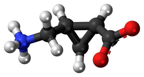 | Keywords: (+)-CAMP-zwitterion-3D-balls.png Ball-and-stick model of the + -cis-2-aminomethylcyclopropane carboxylic acid molecule also known as + -CAMP a GABA agonist This image shows the zwitterionic form Colour code 505050 Carbon C black<br> F0F0F0 Hydrogen H white<br> F51E1E Oxygen O red<br> 3C50FA Nitrogen N blue<br> 2011-02-18 own DS Visualizer Jynto talk Neutral form ball-and-stick version Neutral form space-filling version Zwitterionic form space-filling version cc-zero + -CAMP Cyclopropane derivatives Zwitterions Images by Jynto Ball-and-stick models |