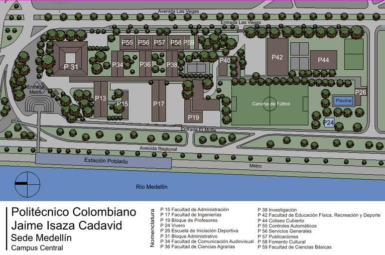 Keywords: Campus-Politecnico Colombiano J I C.png plano del Campus Central Politécnico Colombiano Jaime Isaza Cadavid sede Medellín El mapa esta basado en el plano de la pagina web no es un plano exacto solo es para mostrar la distribución urbana del campus si contiene algún error favor notifíquelo en mi página de usuario en la sección discusión Own 2007-06-24 SajoR Trabajo propio libero todos los derechos dominio público Citar a la Wikipedia si la imagen es utilizada en otros medios que no sean de los proyectos de Wikipedia Universities and colleges in Medellín