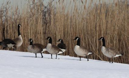 Keywords: canada geese birds waterfowl wildlife nature resting cold winter snow group