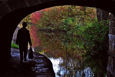 Keywords: canal path person water landscape outdoor scenic pedestrian forest green
