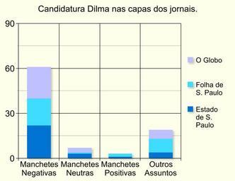 | Keywords: Candidatura Dilma nas capas dos jornais.png O portal Brasil de Fato realizou um levantamento sobre o comportamento dos três jornais de maior circulação no Brasil ante a campanha de Dilma Rousseff candidata do PT para a Presidência da República em 2010 http //www brasildefato com br/node/3320 O estudo foi feito a partir das manchetes de primeira página publicadas em 30 dias que antecederam a votação de primeiro turno entre os dias 28 de agosto e 27 de setembro Constatou-se que a maior parte dos temas abordados foram ligados às eleições com a grande maioria das manchetes adotando um enfoque desfavorável para a candidata do PT No período analisado O Globo não publicou nenhuma manchete positiva à candidata do PT contra 21 manchetes negativas Foram ainda três neutras e seis tratando de outros assuntos como Economia ou Internacional Já a Folha de S Paulo veiculou duas manchetes positivas à campanha petista Lula vai à TV e afirma que Serra partiu para baixaria no dia 8 e Desemprego é o menor e renda é a maior em 8 anos no dia 24 No entanto foram dezoito manchetes negativas além de uma neutra e nove sobre temas diversos O Estado de S Paulo único dos três a declarar em editorial apoio ao candidato José Serra foi o campeão em negativas com relação a Dilma foram 22 capas negativas em apenas um mês O Estado trouxe uma manchete positiva à petista Inquérito da PF esvazia tese de crime político na receita no dia 16 três neutras e quatro abordando outros assuntos 2010-11-15 own assumed Leinad-Z~commonswiki Cc-zero Check categories 2010 November 16 pt wikipedia Partido_da_Imprensa_Golpista 3 Media of Brazil Magazines of Brazil Internet memes |