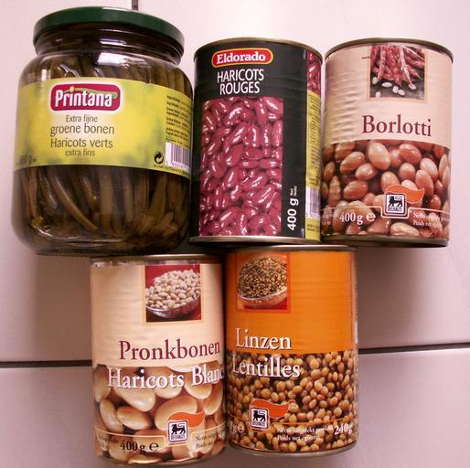 Keywords: Canned beans.JPG en Cans of several types of beans Own KVDP 2009-03-02 Canned beans