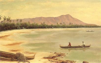| Keywords: 'Canoes at Diamond Head', oil on canvas painting by Edward Bailey, 1890, Maui Historical Society.jpg Waikiki Beach and Diamond Head; by Edward Bailey Bailey House Museum collection Maui Maui Historical Society Edward Bailey 1890 DEFAULTSORT Bailey PD-Art-100 1890s landscape paintings Oil paintings of landscapes Diamond Head in art 1890 Paintings of Waikiki 1890 Canoeing in art Historical images of Honolulu Hawaii 1890 1890 in Hawaii Bailey House Museum Outrigger canoes in art Canoes of Hawaii in art |