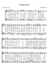 | Keywords: Cantique Suisse.png en The Swiss national anthem with the French lyrics Own Music by Alberich Zwyssig 1808-1854 ; French lyrics by Charles Chatelanat 1833-1907 ; music sheet by User Schutz 1841 The music and the lyrics are in the public domain Cantique Suisse svg LilyPond source <pre> \header composer Alberich Zwyssig title Cantique suisse subtitle poet Charles Chatelanat \paper set-paper-size a4 top-margin 0\cm set-global-staff-size 18 \relative \time 3/4 \new ChoirStaff << \new Staff << \key bes \major \new Voice main \key bes \major \tempo 4 72 f8 f16 f4 bes bes8 a16 a2 f8 f16 f4 c' c8 bes16 bes2 d4 d8 c8 c8 c4 bes8 a4 g2 e4 f2 r4 a8 a16 a4 a bes4 a8 g f f2 \noBreak f2 r4 a8 a16 a4 a bes4 c8 d4 c2 bes4 a2 r4 f8 f16 f4 bes aes8 g16 g2 g8 g16 g4 c4 bes8 a16 a2 d4 d8 ees c bes2 a4 bes2 c4 d4 d8 ees c bes2 bes4 bes a8 g a4 bes2 >> \new Lyrics \lyricsto main \set stanza 1 Sur nos monts quand le so -- leil An -- nonce un bril -- lant ré -- veil Et pré -- dit d'un plus beau jour le re -- tour Les beau -- tés de la pa -- tri -- e Par -- lent à l'âme at -- ten -- dri -- e Au ciel mon -- tent plus joy -- eux Au ciel mon -- tent plus joy -- eux Les ac -- cents d'un coeur pi -- eux Les ac -- cents é -- mus d'un coeur pi -- eux \new Lyrics \lyricsto main \set stanza 2 Lors -- qu'un doux ray -- on du soir Joue en -- core dans le bois noir Le coeur se sent plus heu -- reux près de Dieu Loin des vains bruits de la plai -- ne L'âme en paix est plus se -- rei -- ne Au ciel mon -- tent plus joy -- eux Au ciel mon -- tent plus joy -- eux Les ac -- cents d'un coeur pi -- eux Les ac -- cents é -- mus d'un coeur pi -- eux \new Lyrics \lyricsto main \set stanza 3 Lors -- que dans la som -- bre nuit La fou -- dre é -- clate avec bruit No -- tre coeur pres -- sent en -- core le Dieu fort Dans l'o -- ra -- ge et la dé -- tresse Il est no -- tre for -- te -- re -- se Of -- frons Lui des coeurs pi -- eux Of -- frons Lui des coeurs pi -- eux Dieu nous bé -- ni -- ra des cieux Dieu nous bé -- ni -- ra du haut des cieux \new Lyrics \lyricsto main \set stanza 4 Des grand monts vient le se -- cours Suisse es -- père en Dieu tou -- jours Gar -- de la foi des aï -- eux vis comme eux Sur l'au -- tel de la pa -- tri -- e Mets tes biens ton coeur ta vi -- e C'est le tré -- sor pré -- ci -- eux C'est le tré -- sor pré -- ci -- eux Que Dieu bé -- ni -- ra des cieux Que Dieu bé -- ni -- ra du haut des cieux \new Staff << \key bes \major \new Voice d 8 d16 d4 d ees8 ees16 ees2 <c ees>8 <c ees>16 ees4 ees ees8 d16 d2 bes'4 bes8 f c e2 <f c>4 d2 c8 bes a2 r4 c8 c16 c4 ees d2 ees8 d c4 <c ees> d c2 r4 c8 c16 c4 f f4 f8 f4 f ees d c2 r4 d8 d16 d4 bes <bes f'>8 <bes ees>16 <bes ees>2 <bes ees>8 <bes ees>16 <bes ees>4 <ees g> <d f>8 <c f>16 <c f>2 f4 fis8 g ees d2 <c ees>4 <bes d>2 <c f>4 <f bes>4 <fis bes>8 <g bes> <ees g> <d f>2 <des f>4 <c f>2 <ees f>4 <d f>2 >> >> \version 2 10 33 </pre> PD-old Swiss national anthem Sheet music |
