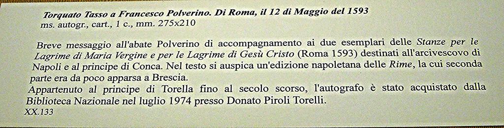 Keywords: torquato tasso torquatotasso francesco polverino francescopolverino autograph rome naples literature writer national library nationallibrary text document writing Canzone "A Napoli" by Torquato Tasso (Sorrento 1544-Rome 1595) - autograph dated Rome, May 12, 1593 - Temporary exhibition - National Library of Naples - "Real Città cui par non vede il Sole / Di beltà, di valor ch'in sen racchiudi / Le ceneri onorate e gli ossi ignudi / Di Lei che mi produsse e fu tua prole". Canzone "A Napoli" by Torquato Tasso (Sorrento 1544-Rome 1595) - autograph dated Rome, May 12, 1593 - Temporary exhibition - National Library of Naples - "Real Città cui par non vede il Sole / Di beltà, di valor ch'in sen racchiudi / Le ceneri onorate e gli ossi ignudi / Di Lei che mi produsse e fu tua prole". |