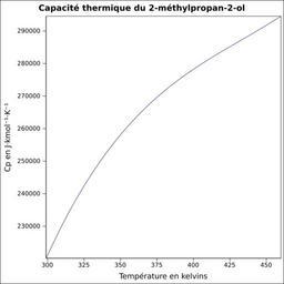 | Keywords: Capacité thermique 2-méthylpropan-2-ol.svg fr Capacité thermique liquide calculée d'après <br/> Robert H Perry et Donald W Green Perry's Chemical Engineers' Handbook McGraw-Hill USA 1997 7e éd 2400 p ISBN 0-07-049841-5 p 2-170 own Epop 2010-06-28 Created with Gnumeric Heat capacity |