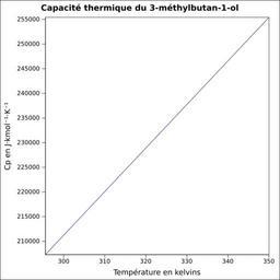| Keywords: Capacité thermique 3-méthylbutan-1-ol.svg fr Capacité thermique liquide calculée d'après <br/> Robert H Perry et Donald W Green Perry's Chemical Engineers' Handbook McGraw-Hill USA 1997 7e éd 2400 p ISBN 0-07-049841-5 p 2-170 own Epop 2010-06-28 Created with Gnumeric Heat capacity |