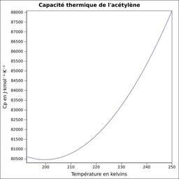 | Keywords: Capacité thermique acétylène.svg fr Capacité thermique liquide calculée d'après <br/> Robert H Perry et Donald W Green Perry's Chemical Engineers' Handbook McGraw-Hill USA 1997 7e éd 2400 p ISBN 0-07-049841-5 p 2-170 own Epop 2010-06-28 Created with Gnumeric Heat capacity |