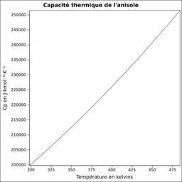 | Keywords: Capacité thermique anisole.svg fr Capacité thermique liquide calculée d'après <br/> Robert H Perry et Donald W Green Perry's Chemical Engineers' Handbook McGraw-Hill USA 1997 7e éd 2400 p ISBN 0-07-049841-5 p 2-170 own Epop 2010-06-28 Created with Gnumeric Heat capacity |