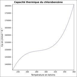 | Keywords: Capacité thermique chlorobenzène.svg fr Capacité thermique liquide calculée d'après <br/> Robert H Perry et Donald W Green Perry's Chemical Engineers' Handbook McGraw-Hill USA 1997 7e éd 2400 p ISBN 0-07-049841-5 p 2-170 own Epop 2010-06-28 Created with Gnumeric Heat capacity |