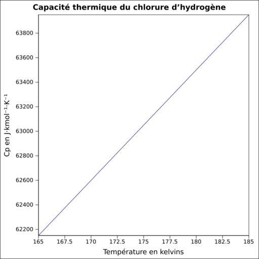 | Keywords: Capacité thermique chlorure d’hydrogène.svg fr Capacité thermique liquide calculée d'après <br/> Robert H Perry et Donald W Green Perry's Chemical Engineers' Handbook McGraw-Hill USA 1997 7e éd 2400 p ISBN 0-07-049841-5 p 2-170 own Epop 2010-06-28 Created with Gnumeric Heat capacity |