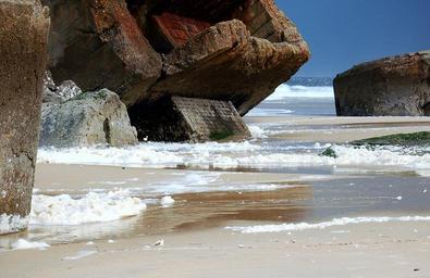 Keywords: capbreton sea beach bunker france french coast stones nature landscapes landscape rocks blue foam low tide tide war battle bunkers background costa ocean temporary