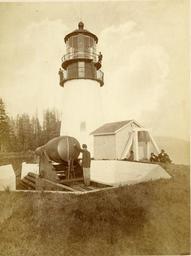 | Keywords: Cape Disappointment Lighthouse 1871.jpg Cape Disappointment Lighthouse at the mouth of the Columbia River; also a nearby cannon shown from the coast artillery battery that was also on the same site http //www uscg mil/history/weblighthouses/19thCenturyLights asp USCG historian or 1871 1872 Eadweard Muybridge 1830-1904 Public domain due to age unknown Cape Disappointment Lighthouse Coastal artillery Eadweard Muybridge PD-old | ||||