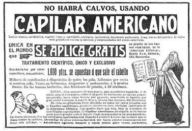 | Keywords: Capilar-Americano-1914-05-14-Nuevo-Mundo.jpg es No habrà calvos usando Capilar Americano se aplica gratis en prueba de sus buenos resultados en la American Clinica Ronda San Antonio 102 Barcelona Nuevo Mundo Madrid 14 5 1914 Juan Garcia Bravo 1914-05-14 No habrà calvos usando CAPILAR AMERICANO Locion tonica antiseptica vegetal limpia agradable energica inofensiva finamente perfumada Gran tonico del cerebro El exito mas grandioso contra la calvicie y enfermedades del cuero cabelludo Unica en el mundo que SE APLICA GRATIS tratamiento scientifico unico y exclusivo En prueba de sus buenos resultados en la American Clinica Ronda San Antonio 102 Barcelona Desahuciados por otros especificos Desconfiados 1 000 PTAS SE APUESTAN A QUE SALE EL CABELLO Millares de certificados a disposicion de quien los pida Informes por carta si remiten sello Venta en farmacias droguerias y perfumerias a 6 pesetas frasco En las buenas barberias dan fricciones de prueba a 50 centimos NOTAS - Con aumento de una peseta para posesiones españolas y de cinco para el extranjero sobre el importe de los frascos se envian paquetes postales hasta cinco frascos por paquete remitiendo el importe por giro postal ò cheque a JUAN G BRAVO Ronda San Antonio 102 Barcelona En vista del grandioso exito obtenido en todos los casos tratados con el Capilar americano pronto se habriran en otras ciudades sucursales de la American Clinica con iguales fines que esta bajo la direccion de acreditados especialistas El Capilar americano no engaña; se da barato para que lo pruebe todo el mundo Cada consumidor es un propagandista Un frasco convence por su excelentes cualidades està llamado a sustituir a todas las lociones que se dicen contra la calvicie desconfiar de otras recomendaciones que hacen algunos comerciantes por tener mas utilidad “ Admitense agentes buenos y casas serias para venta exclusiva PD-old Capilar Americano Capilar Americano Nuevo Mundo 1914 advertisements in Spain Juan Garcia-Bravo Menendez American Clinica ronda de San Antonio 102 Uploaded with UploadWizard ImageNote 1 37 25 913 627 988 671 2 No habrà calvos usando CAPILAR AMERICANO Locion tonica antiseptica vegetal limpia agradable energica inofensiva finamente perfumada Gran tonico del cerebro El exito mas grandioso contra la calvicie y enfermedades del cuero cabelludo Unica en el mundo que SE APLICA GRATIS tratamiento scientifico unico y exclusivo En prueba de sus Buenos resultados en la American Clinica Ronda San Antonio 102 Barcelona Desahuciados por otros especificos Desconfiados 1 000 PTAS SE APUESTAN A QUE SALE EL CABELLO Millares de certificados a disposicion de quien los pida Informes por carta si remiten sello Venta en farmacias droguerias y perfumerias a 6 pesetas frasco En las buenas barberias dan fricciones de prueba a 50 centimos NOTAS - Con aumento de una peseta para posesiones españolas y de cinco para el extranjero sobre el importe de los frascos se envian paquetes postales hasta cinco frascos por paquete remitiendo el importe por giro postal ò cheque a JUAN G BRAVO Ronda San Antonio 102 Barcelona En vista del grandioso exito obtenido en todos los casos tratados con el Capilar americano pronto se habriran en otras ciudades sucursales de la American Clinica con iguales fines que esta bajo la direccion de acreditados especialistas El Capilar americano no engaña; se da barato para que lo pruebe todo el mundo Cada consumidor es un propagandista Un frasco convence por su excelentes cualidades està llamado a sustituir a todas las lociones que se dicen contra la calvicie Desconfiar de otras recomendaciones que hacen algunos comerciantes por tener mas utilidad “ Admitense agentes buenos y casas serias para venta exclusiva ImageNoteEnd 1 |