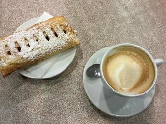 Keywords: cappuccino coffee gourmet pastry snack tart cream drink café brown black hot espresso cup dark mocha fresh latte