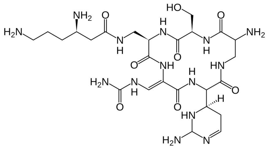 Keywords: Capreomycin IA.svg Skeletal formula of capreomycin IA Created using http //www acdlabs com/download/chemsk html ACD/ChemSketch 10 0 and Inkscape Own 2007-11-14 Fvasconcellos 16 39 14 November 2007 UTC Aminoglycoside antibiotics Peptides