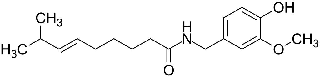 | Keywords: Capsaicin 200.svg validSVG Structure of E -N- 4-hydroxy-3-methoxybenzyl -8-methylnon-6-enamide Own 2014-04-08 Emeldir <span class signature-talk >talk</span> Chemical structure verified https //upload wikimedia org/wikipedia/commons/a/af/Capsaicin_200 svg 1S/C18H27NO3/c1-14 2 8-6-4-5-7-9-18 21 19-13-15-10-11-16 20 17 12-15 22-3/h6 8 10-12 14 20H 4-5 7 9 13H2 1-3H3 H 19 21 /b8-6+ YKPUWZUDDOIDPM-SOFGYWHQSA-N 404-86-4 Synonyms <small> 6E -N- 4-Hydroxy-3-methoxyphenyl methyl-8-methyl-6-nonenamide E -8-Methyl-N-vanillylnon-6-enamide E -8-Methyl-non-6-enoic acid 4-hydroxy-3-methoxy-benzylamide E -N- 4-Hydroxy-3-methoxybenzyl -8-methylnon-6-enamide E -N- 4-Hydroxy-3-methoxyphenyl -methyl-8-methyl-6-nonenamide E -N- 4-Hydroxy-3-methoxyphenyl methyl-8-methyl-6-nonenamide E -N- 4-hydroxy-3-methoxyphenyl methyl-8-methylnon-6-enamide 6-Nonenamide 8-methyl-N-vanillyl- E - 8CI 6-Nonenamide N- 4-hydroxy-3-methoxyphenyl methyl-8-methyl- E - 6-Nonenamide N- 4-hydroxy-3-methoxyphenyl methyl-8-methyl- E - 9CI 8-Methyl-N-vanillyl-6-nonenamide 8-Methyl-N-vanillyl-6-nonenamide E - 8-Methyl-N-vanillyl-6-noneneamide 8-Methyl-N-vanillyl-trans-6-nonenamide Axsain BRN 2816484 Capsacutin Capsaicin Capsaicin in oleoresin of capsicum Capsaicin dermal patch - NeurogesX Capsaicina Capsaicine Capsaicinum Capsaiene Caswell No 158 CCRIS 1588 E-Capsaicin EPA Pesticide Chemical Code 070701 FEMA No 3404 HSDB 954 Isodecenoic acid vanillylamide Kapsaicin Kapsaicyna Kapsaisiini Mioton N- 4-Hydroxy-3-methoxyphenyl methyl-8-methyl-6-nonenamide Natural capsaicin NCI-C56564 NGX 4010 Nonenamide 8-methyl-N-vanillyl- E - Nonenamide N- 4-hydroxy-3-methoxyphenyl methyl -8-methyl- E - NSC 56353 Pelargonin acid vanillylamide Qutenza Styptysat trans-8-Methyl-n-vanillyl-trans-6-nonenamide Transacin Transdolor Pain Treatment System Z-Capsaicin Zacin Zostrix</small> PD-chem Capsaicin |