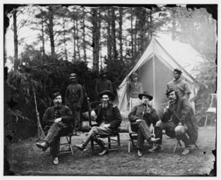 | Keywords: Capt James M Robertson 1st Brigade Horse Artillery.jpg en View of Capt James M Robertson 1st Brigade Horse Artillery February 1864 Photograph is from the main eastern theater of the Civil War winter quarters at Brandy Station Virginia The print shows uniformed African-American in back of white officers Glass wet collodion negative http //memory loc gov/service/pnp/cwpb/04000/04044v jpg Author 1864-02 PD-old Culpeper County Virginia 1864 in Virginia James Madison Robertson | ||||